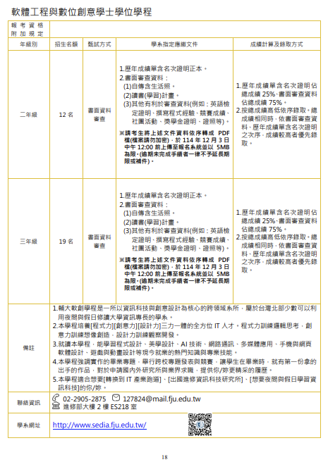 招生簡章:https://exam.fju.edu.tw/admission/204