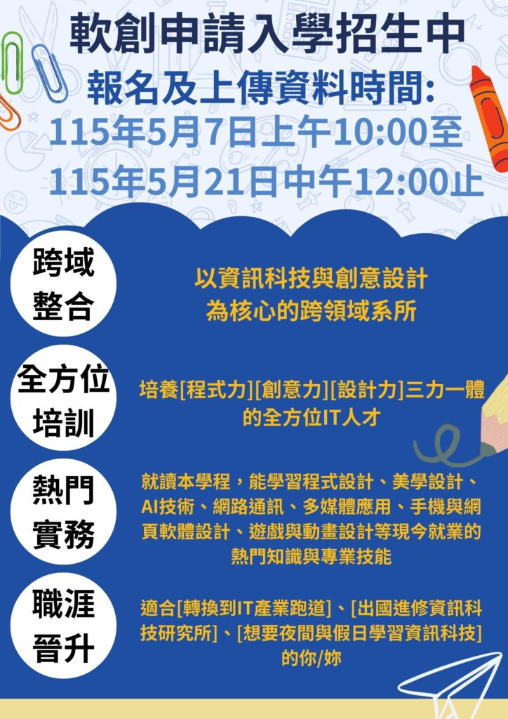 1. 輔大軟創學程是一所以資訊科技與創意設計為核心的跨領域系所,屬於台灣北部少數可以利用夜間與假日修讀大學資訊專長的學系。
